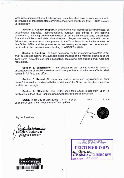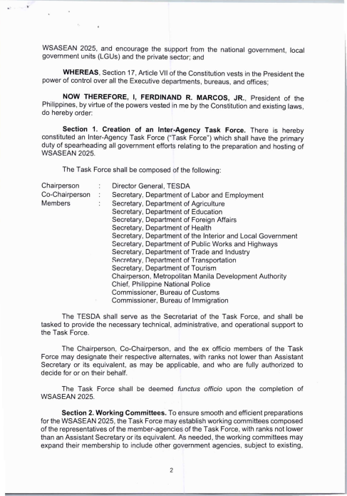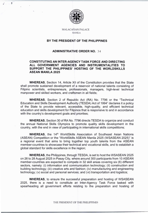 President Ferdinand “Bongbong†Marcos, Jr. has signed Administrative Order No. 34 directing relevant government agencies to support and ensure the Philippines’ successful hosting of the WorldSkills ASEAN Manila 2025 this August.